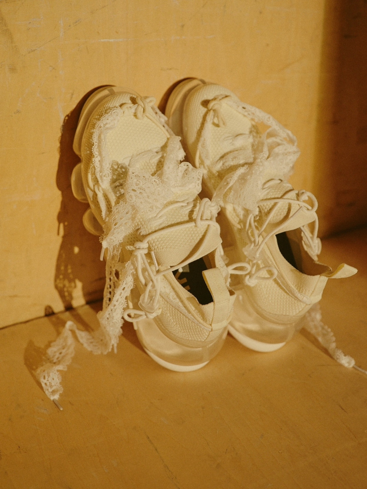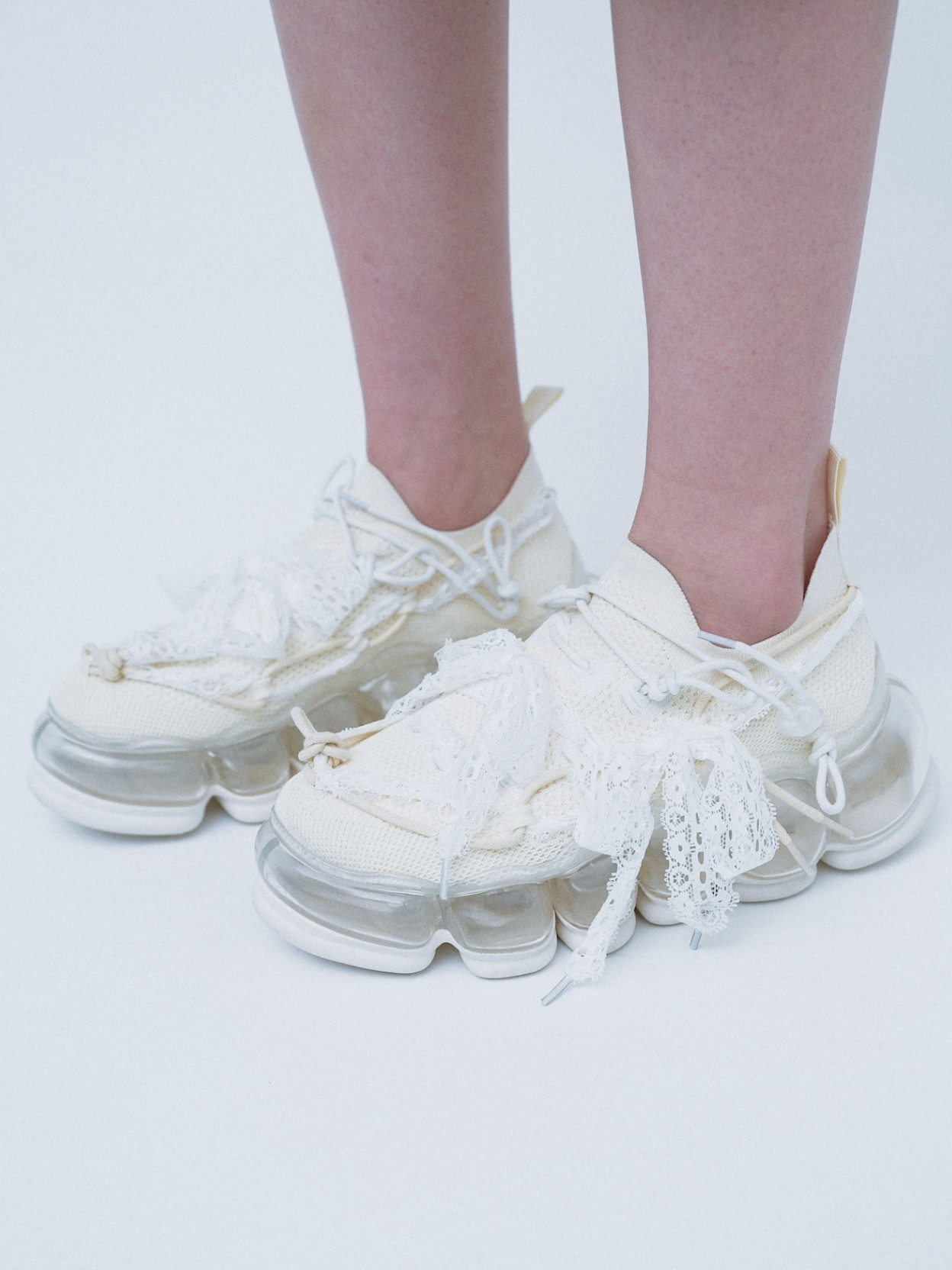 Shoes with two-tone knit upper and shoelaces made of a mix of different materials. The upper laces and cord stopper allow size adjustment.